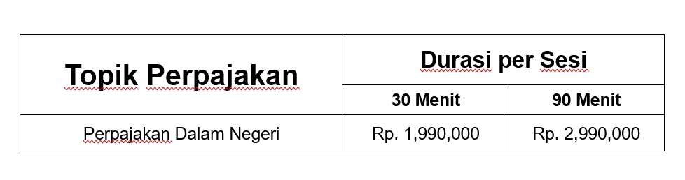Konsultasi dilakukan dalam 1 sesi dengan pilihan durasi waktu 30 menit atau 90 menit menggunakan zoom, google meet, skype, atau google duo bersama Tax Expert kami.