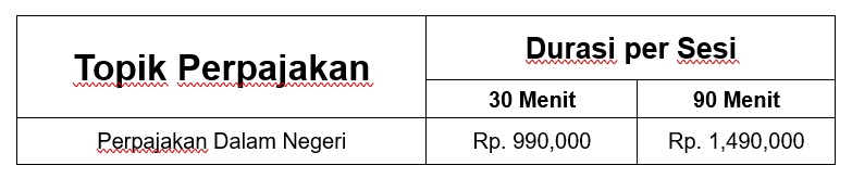 Konsultasi dilakukan dalam 1 sesi dengan pilihan durasi waktu 30 menit atau 90 menit menggunakan zoom, google meet, skype, atau google duo bersama Tax Expert kami.